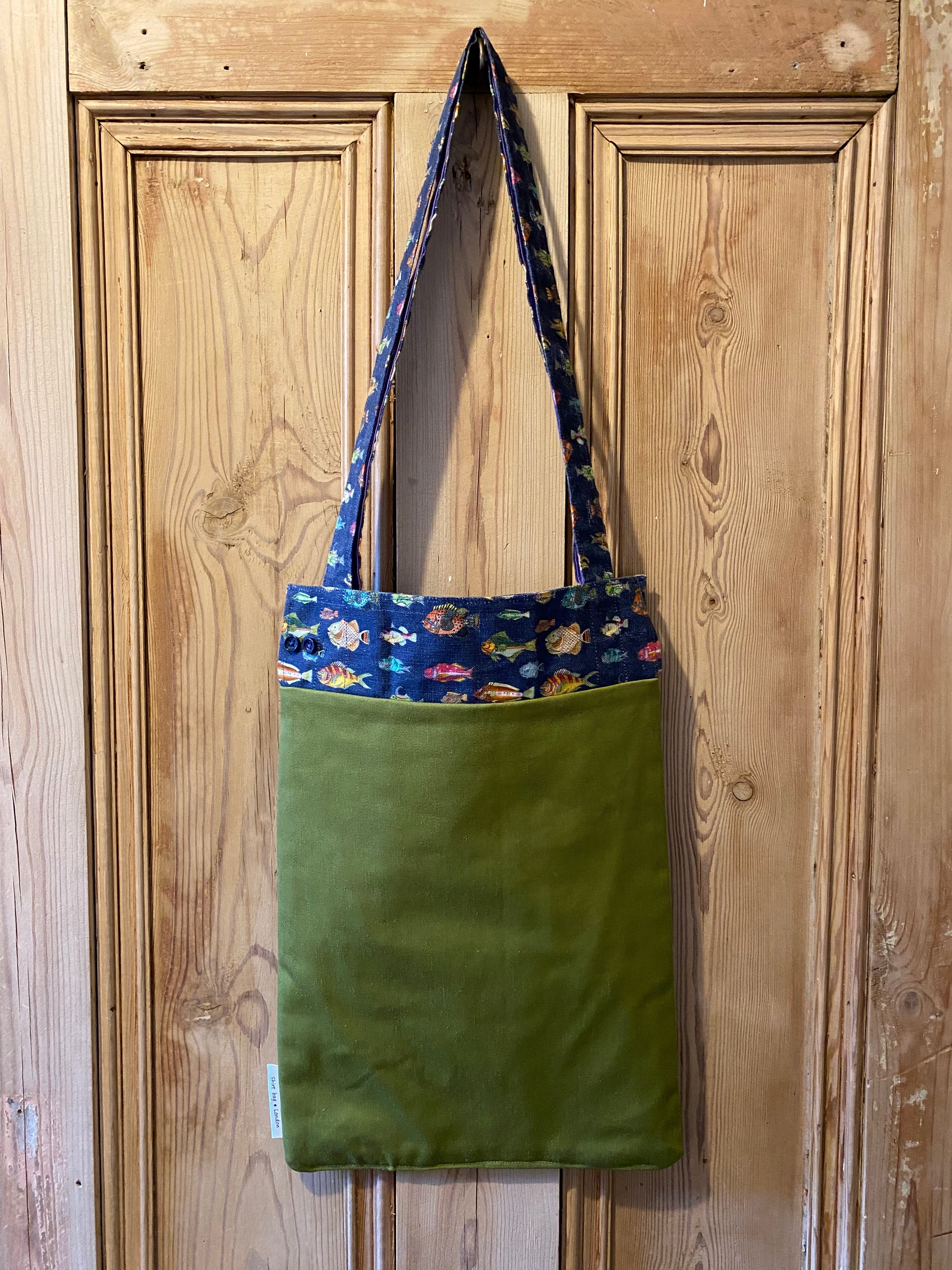 The Off the Cuff tote bag (27 x 37cm approx) is made from a pair cuffs, recycled curtains or other preloved fabrics and has a phone sized internal pocket made from an offcut of the matching shirt.