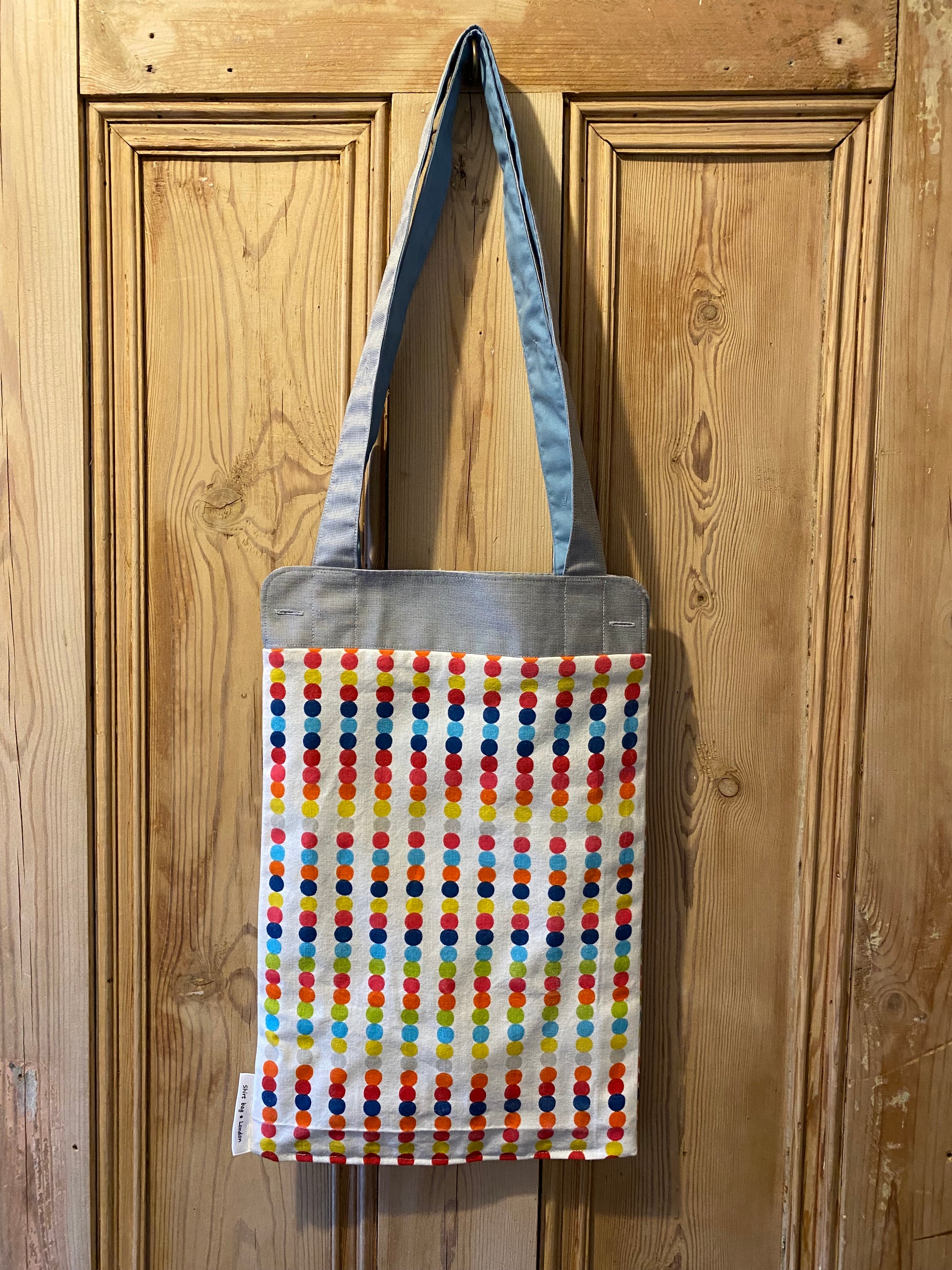 The Off the Cuff tote bag (27 x 37cm approx) is made from a pair cuffs, recycled curtains or other preloved fabrics and has a phone sized internal pocket made from an offcut of the matching shirt.