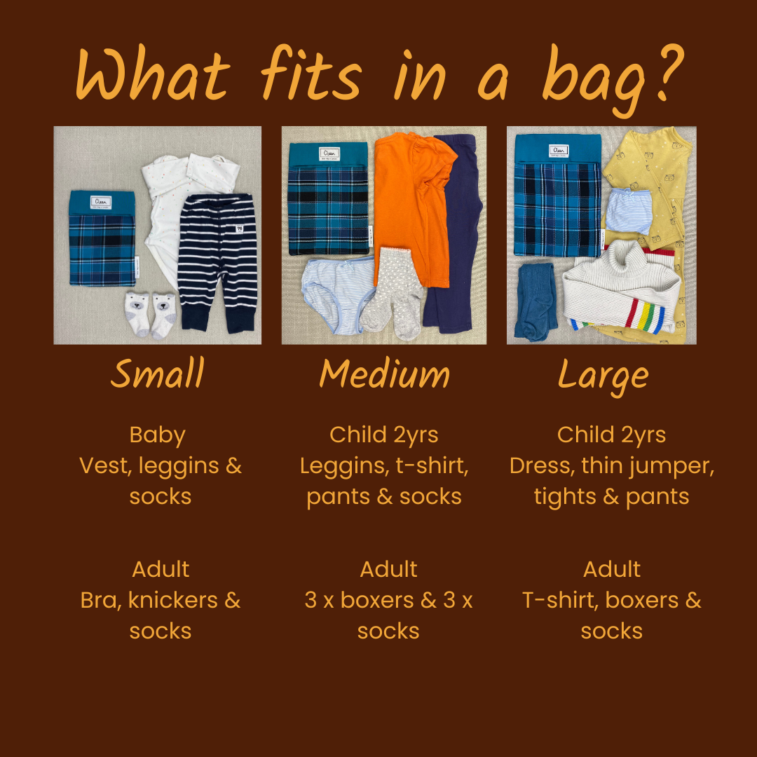 Set of 3: Small (A5 / 15 x 22cm approx), Medium (18 x 24cm approx) and Large (A4 / 22 x 30cm approx) spare clothes bags / packing pods for travelling or baby changing with the labels ‘clean’ and ‘dirty’.