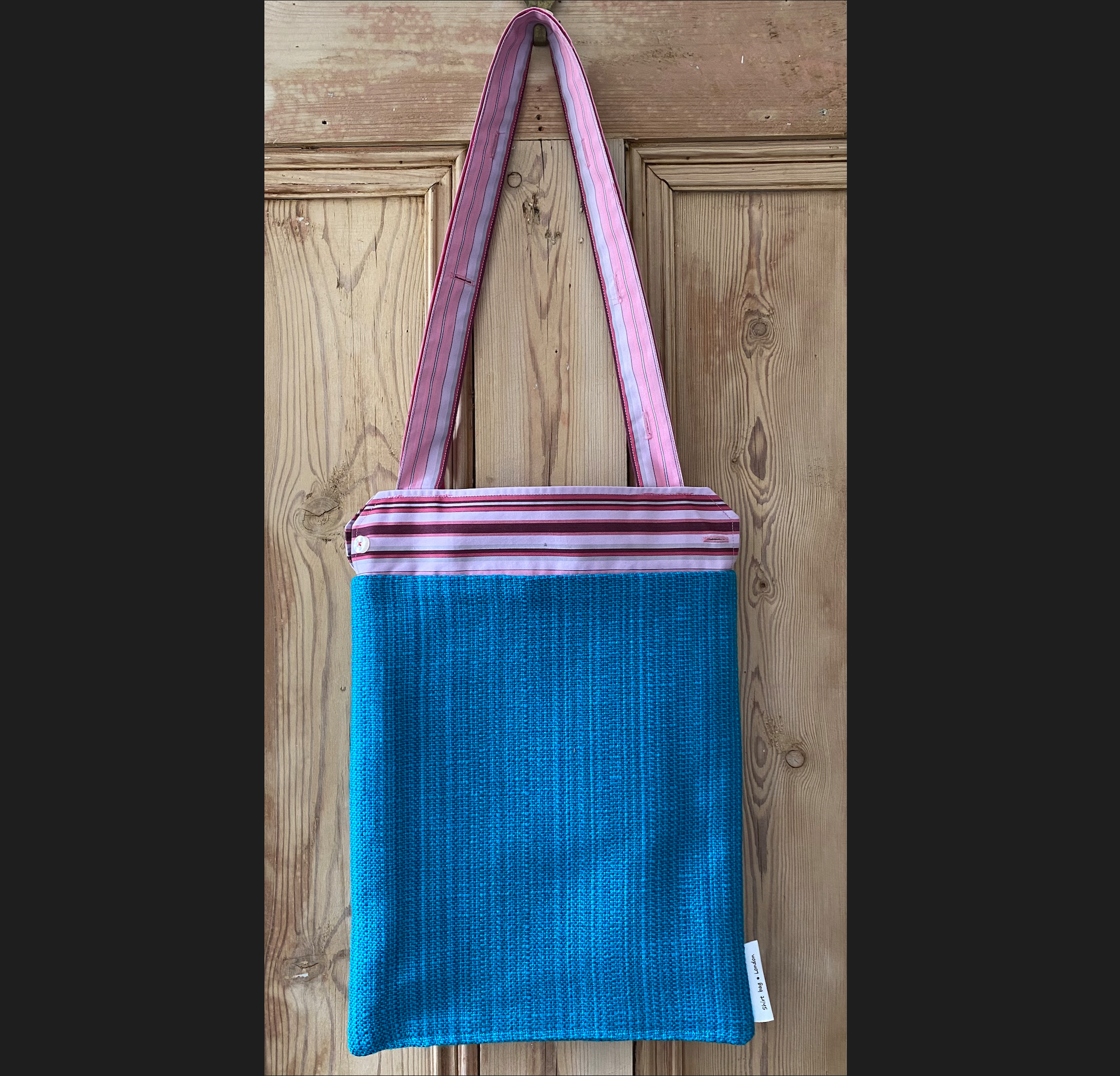 The Off the Cuff tote bag (27 x 37cm approx) is made from a pair cuffs, recycled curtains or other preloved fabrics and has a phone sized internal pocket made from an offcut of the matching shirt.
