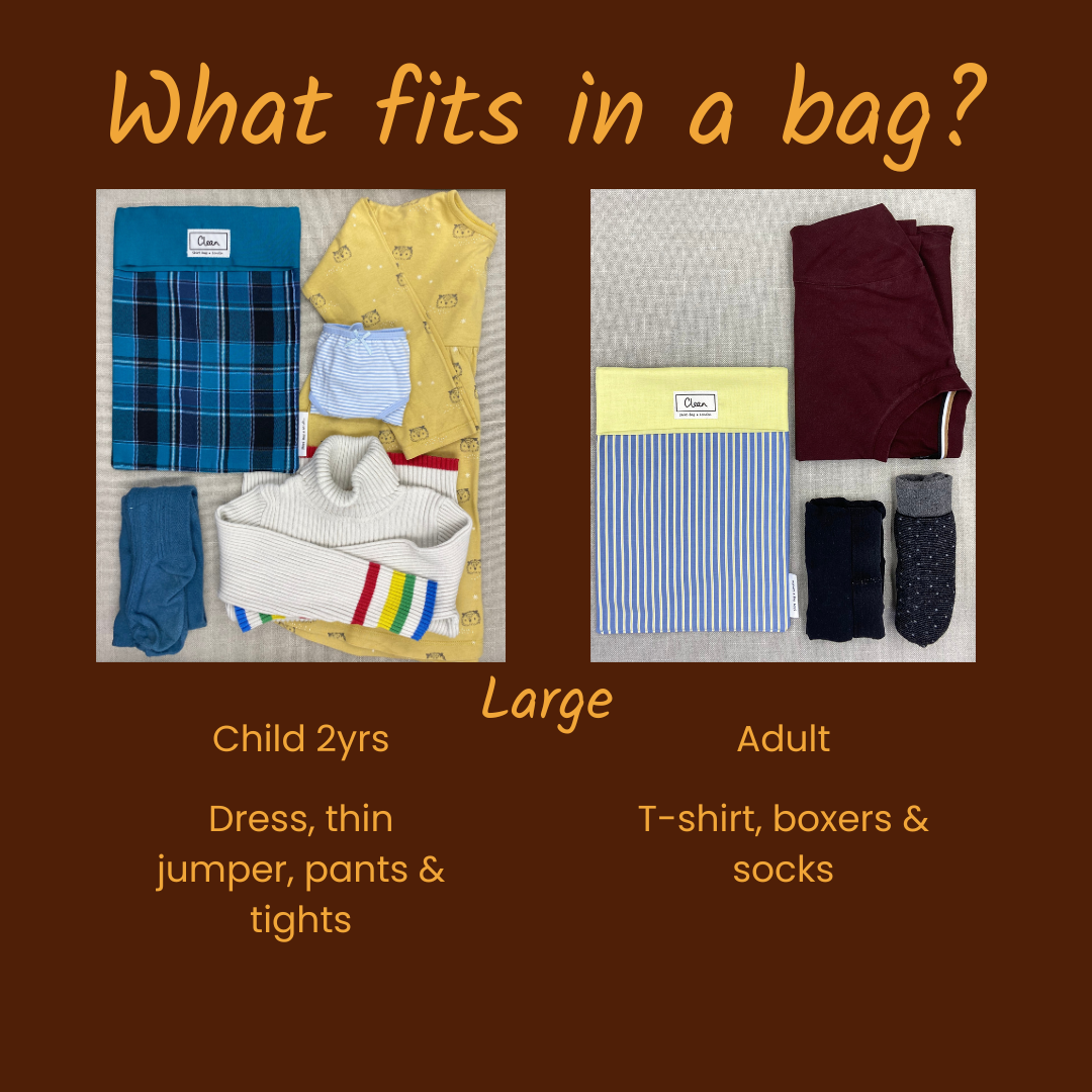 Large (A4 / 22 x 30cm approx) spare clothes bag / packing pod for travelling or baby changing with the labels ‘clean’ and ‘dirty’.