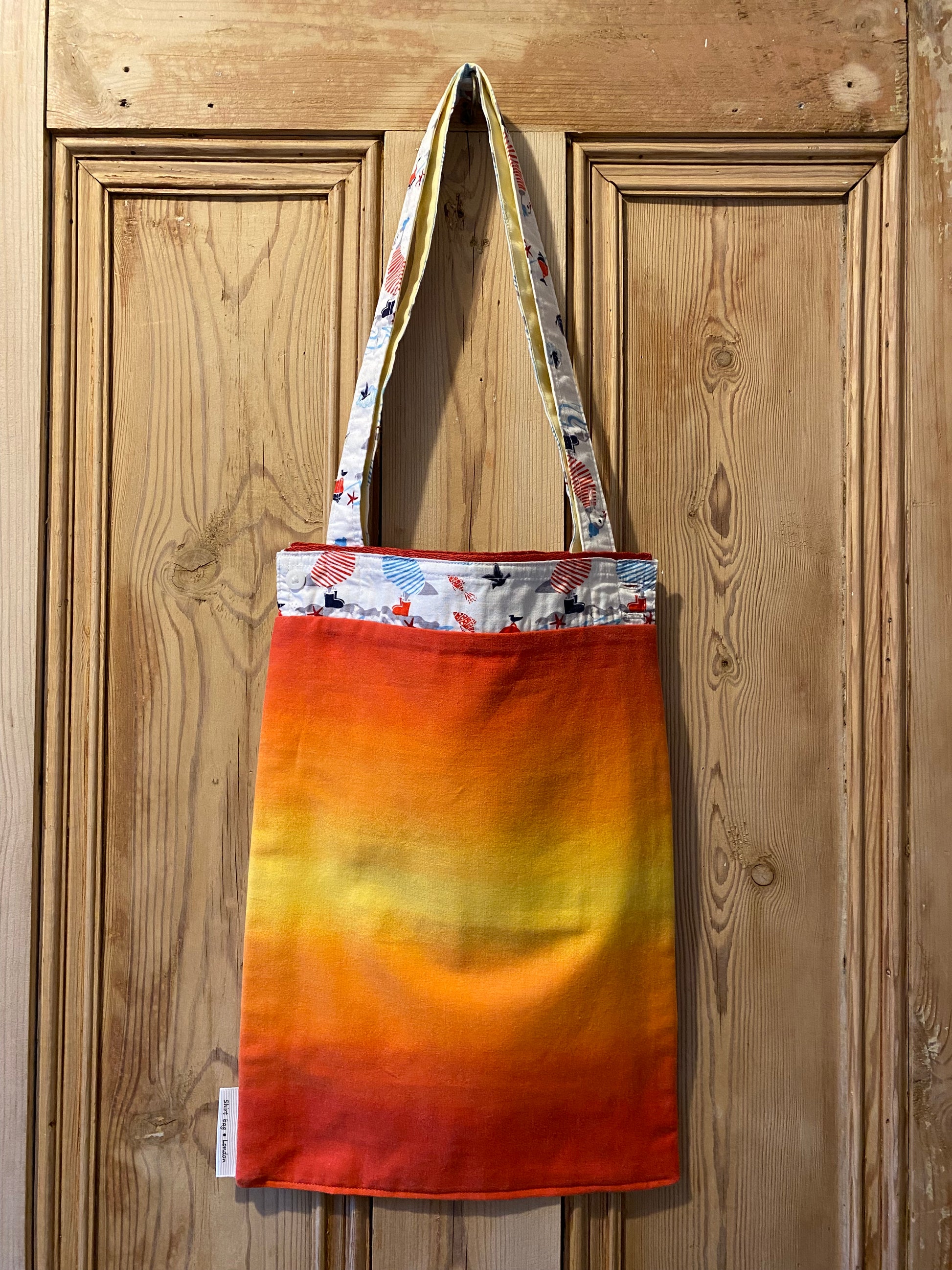The Off the Cuff tote bag (27 x 37cm approx) is made from a pair cuffs, recycled curtains or other preloved fabrics and has a phone sized internal pocket made from an offcut of the matching shirt.