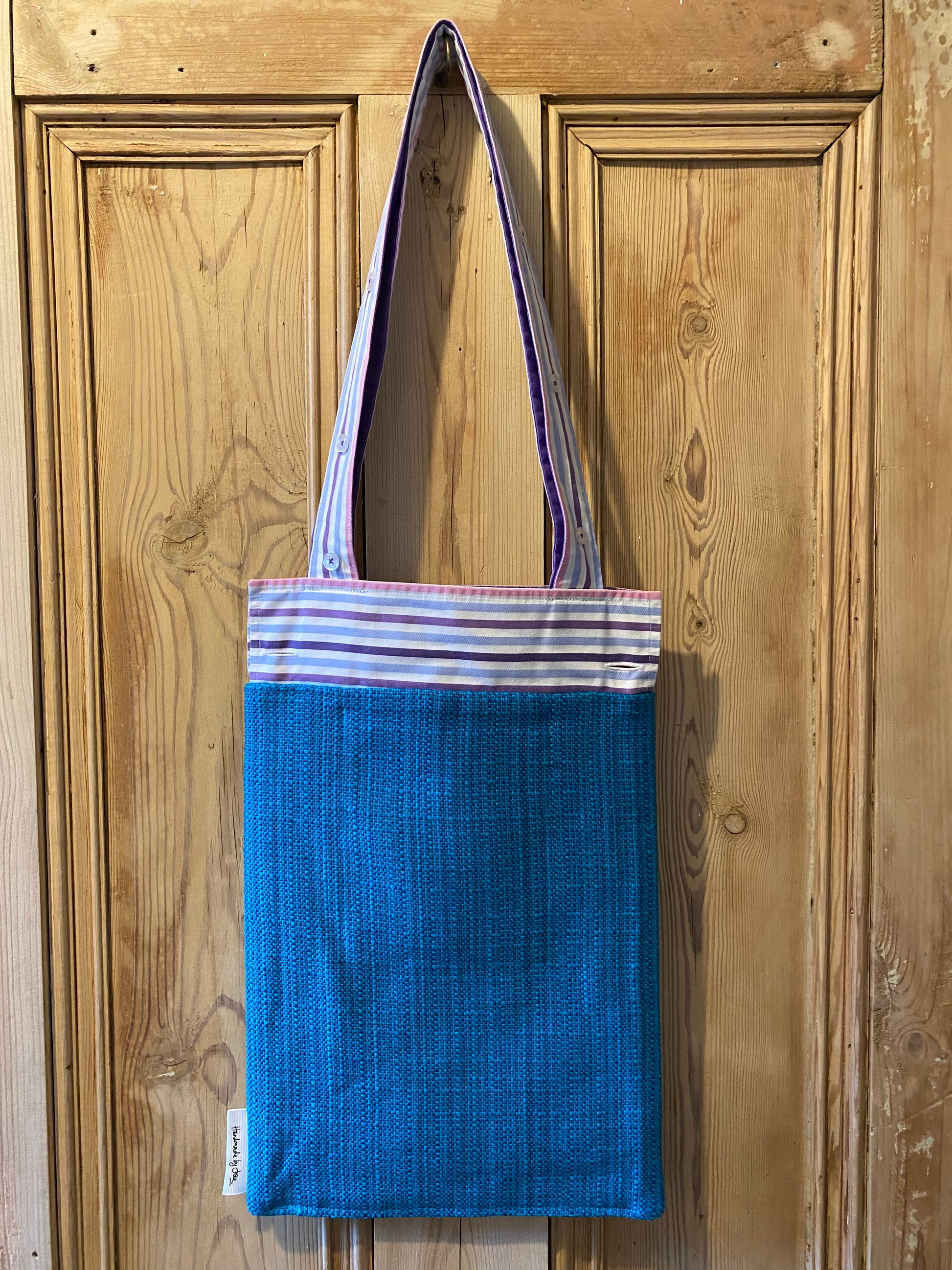 The Off the Cuff tote bag (27 x 37cm approx) is made from a pair cuffs, recycled curtains or other preloved fabrics and has a phone sized internal pocket made from an offcut of the matching shirt.