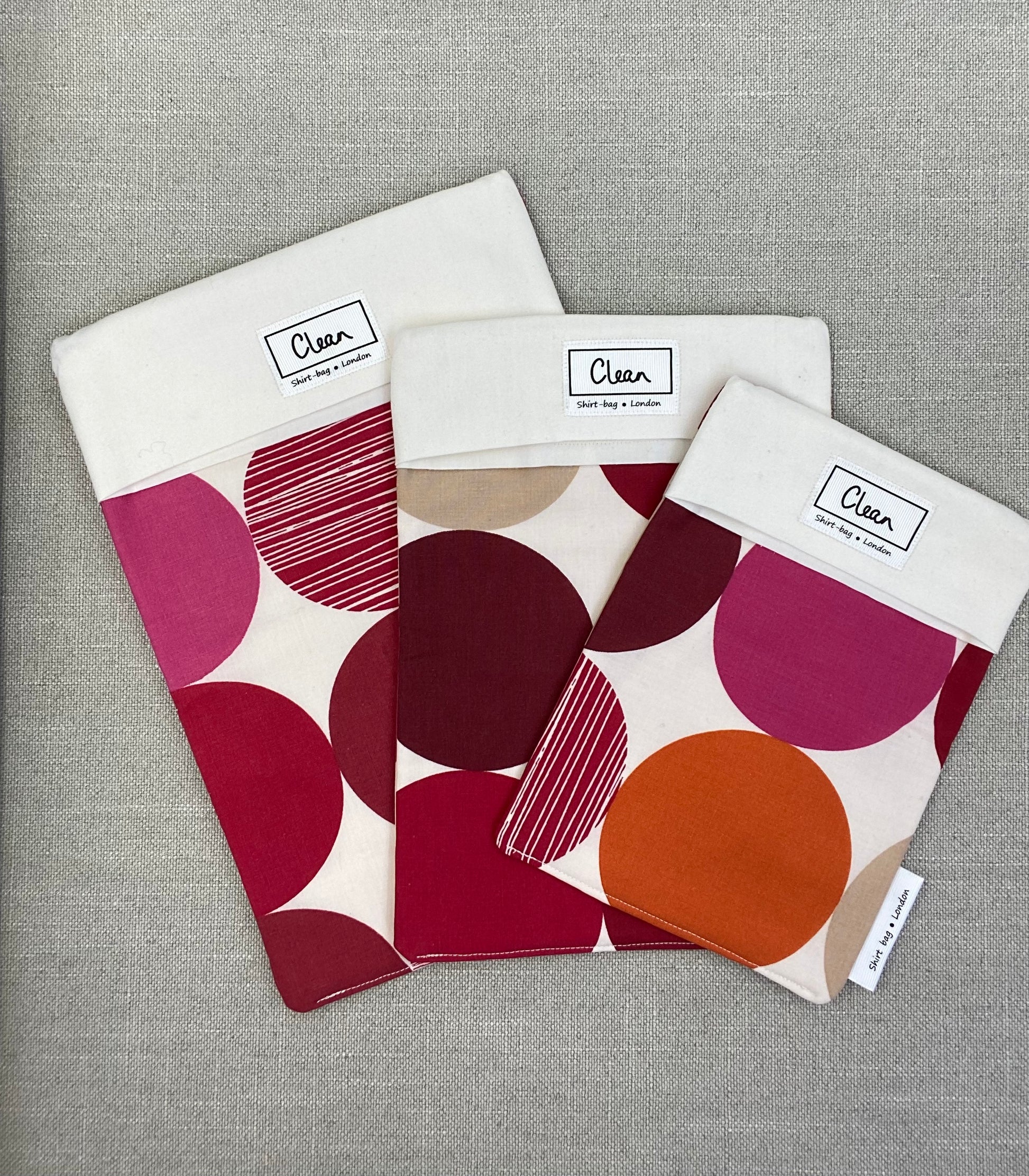 Set of 3: Small (A5 / 15 x 22cm approx), Medium (18 x 24cm approx) and Large (A4 / 22 x 30cm approx) spare clothes bags / packing pods for travelling or baby changing with the labels ‘clean’ and ‘dirty’.
