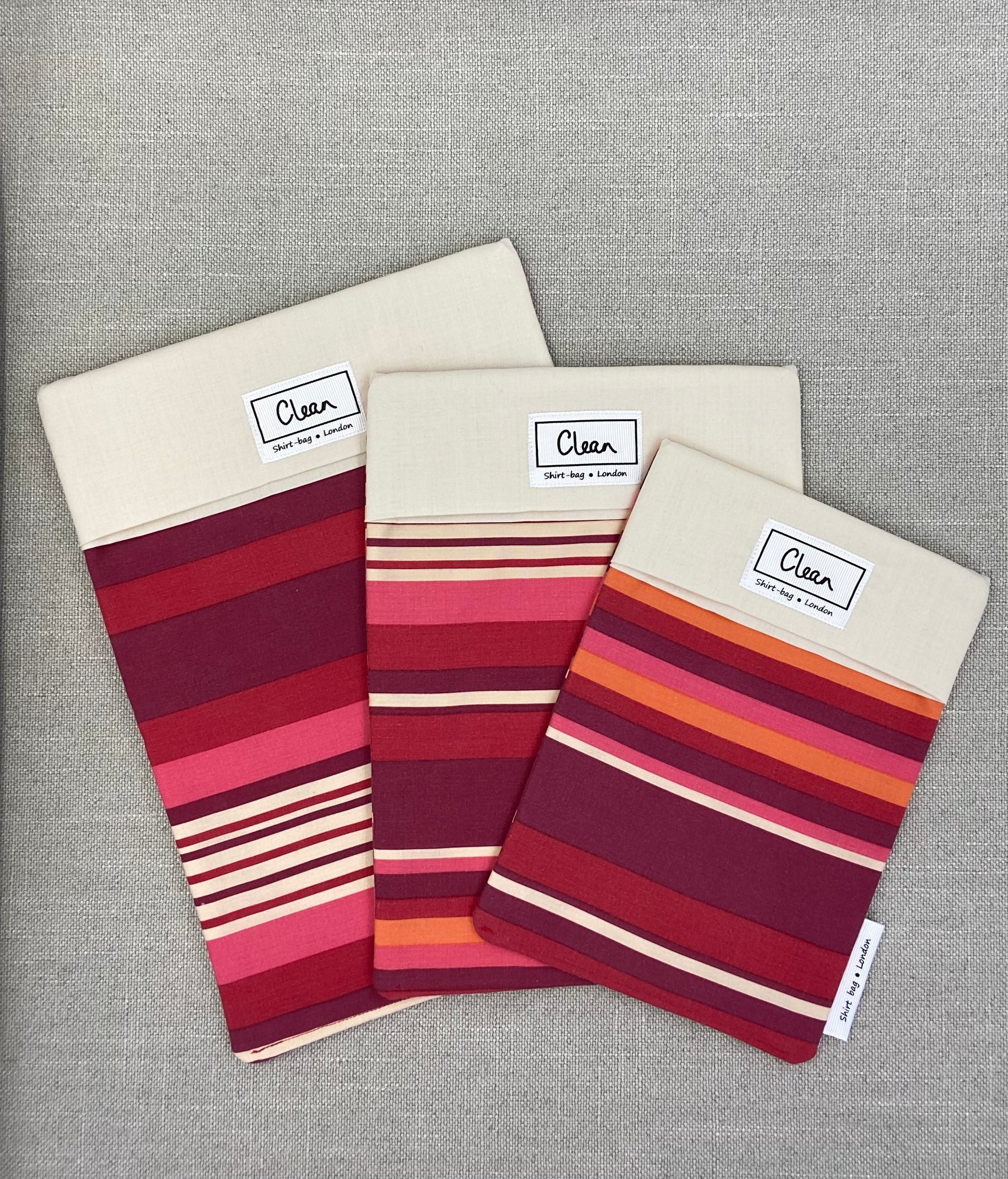 Set of 3: Small (A5 / 15 x 22cm approx), Medium (18 x 24cm approx) and Large (A4 / 22 x 30cm approx) spare clothes bags / packing pods for travelling or baby changing with the labels ‘clean’ and ‘dirty’.