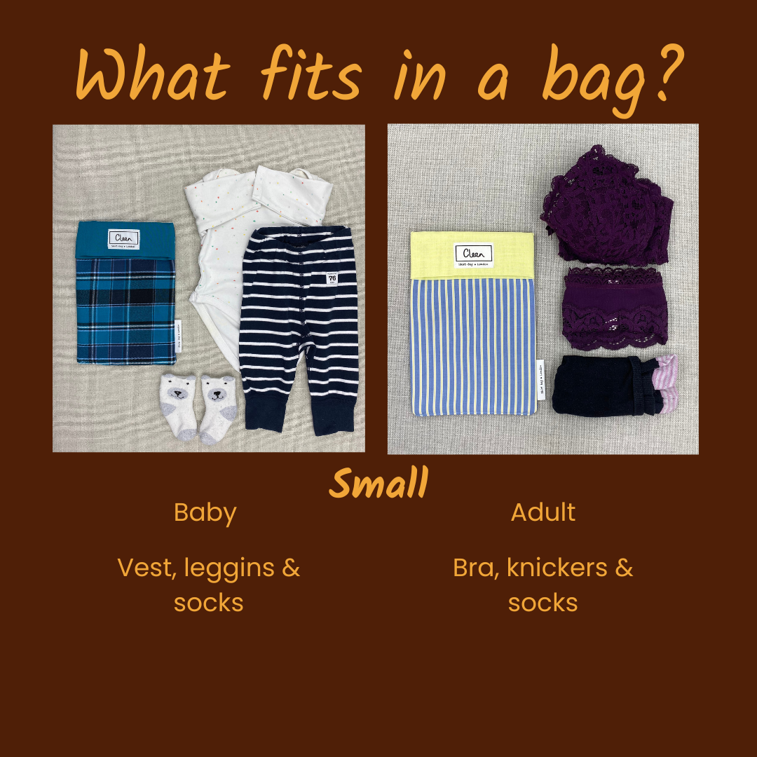 Small (A5 / 15 x 22cm approx) spare clothes bag / packing pod for travelling or baby changing with the labels ‘clean’ and ‘dirty’.
