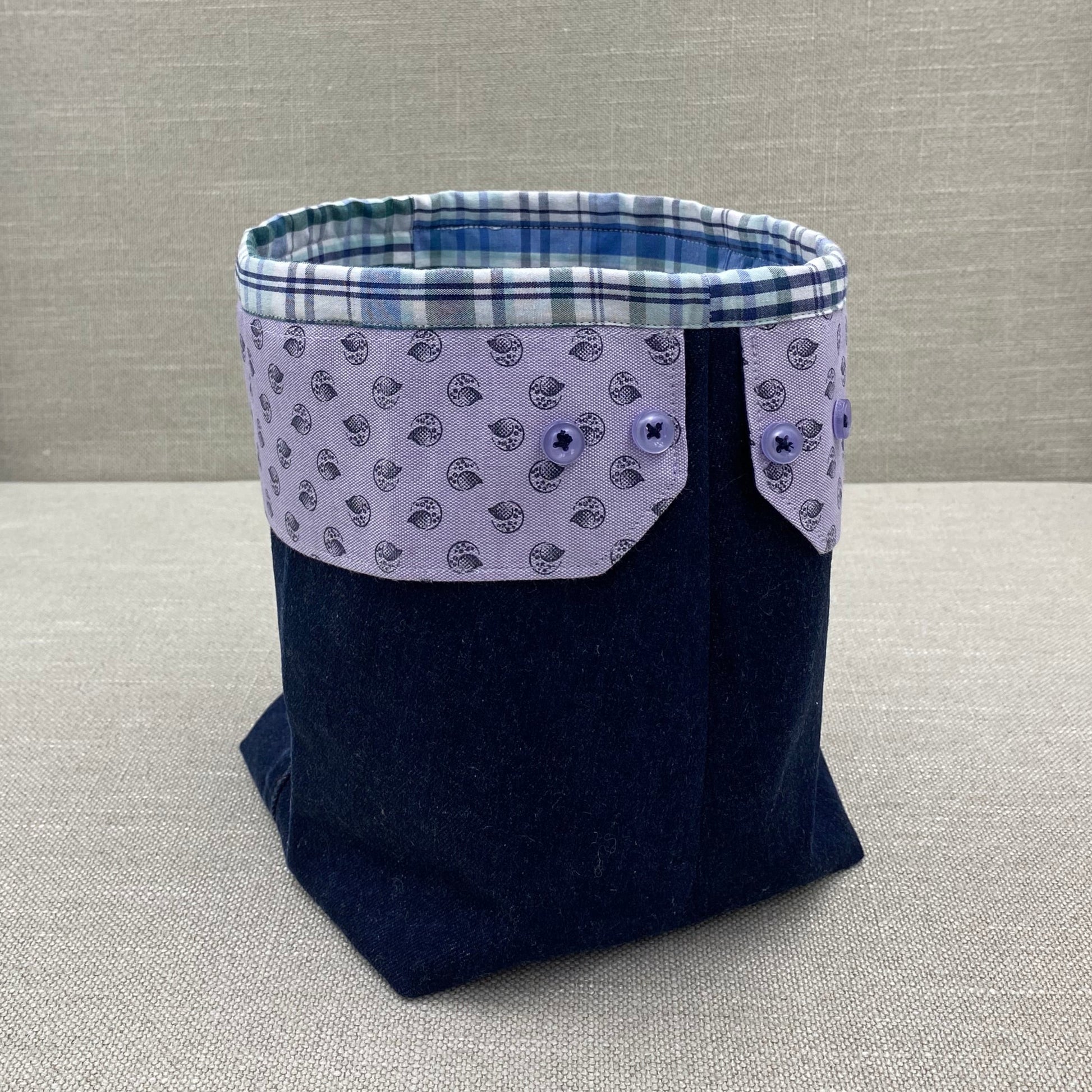 Storage bag - Navy & green white tartan with black motif on lilac cuffs - large