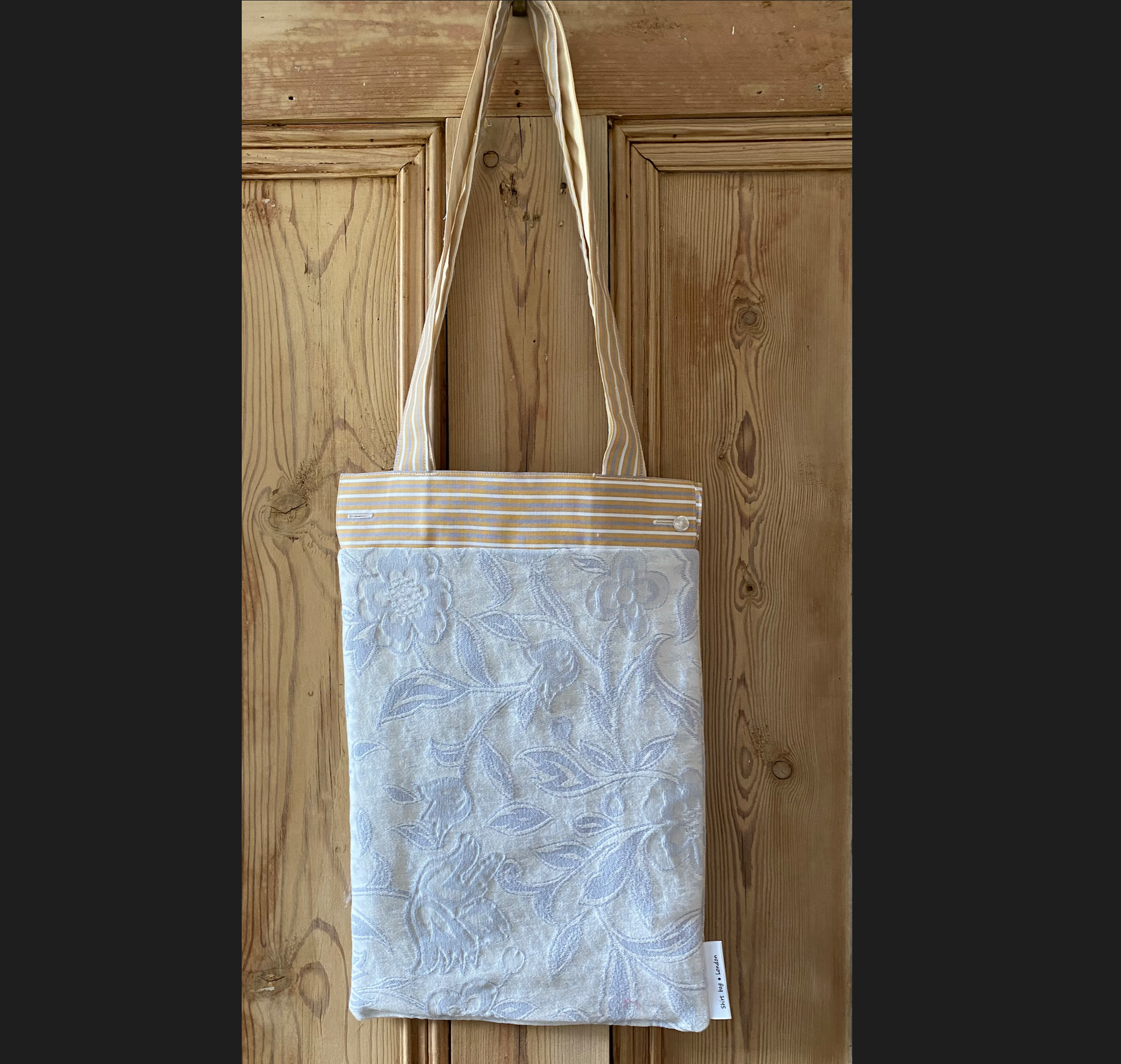 The Off the Cuff tote bag (27 x 37cm approx) is made from a pair cuffs, recycled curtains or other preloved fabrics and has a phone sized internal pocket made from an offcut of the matching shirt.